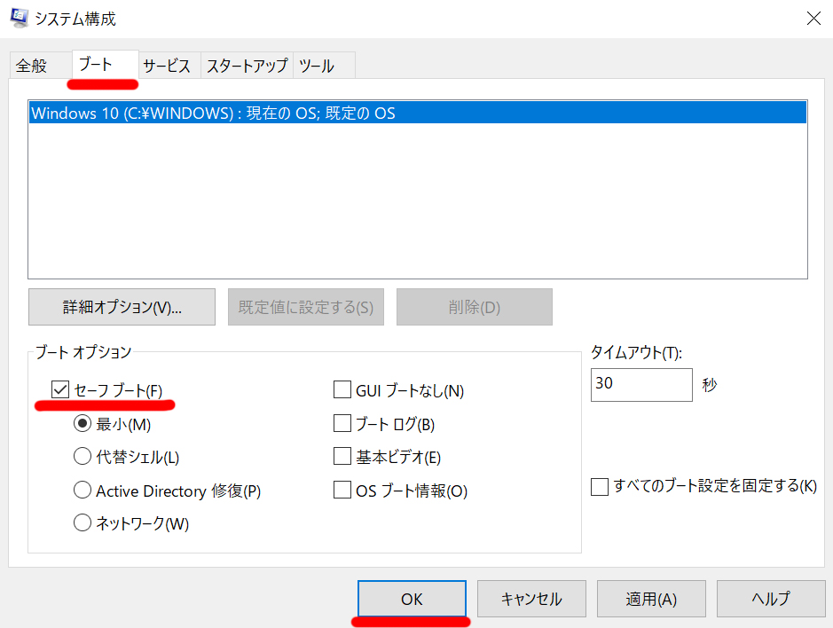 「システム構成」が開くので、「ブート」タブの「ブートオプション」の「セーフブート」にチェックを入れOKを押します。
